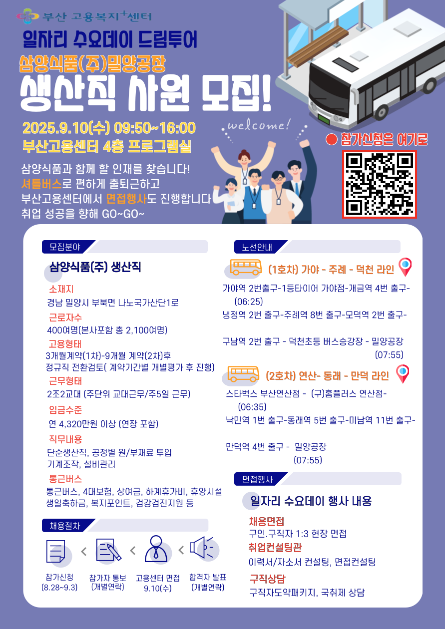 . 2. (구인 업체) 삼양식품(주) 밀양공장 º (모집직종) 생산직(면, 스프 분야별 단순생산직, 원/부재료 투입 및 기계조작 등 º (임금형태) 시급 11,180원 [연봉 4,320만원 이상 (연장근로수당 포함)] º (복리후생) 상여금 100%, 하계휴가비, 생일축하금, 복지포인트 등) º (근무형태) 주야 2교대 (주5일) / 주단위 교대 º (고용형태) (1차)3개월 계약 + (2차)9개월 계약 후 정규직 전환 검토 (계약기간별 개별평가 후 진행) . º (통근버스 운행) [1호차] 가야역 2번 출구(오전출근 06:25 / 오후 출근 17:50 출빌) - 1등 타이어 가야점 - 개금역(4번 출구) - 냉정역(2번 출구) - 주례역(8번 출구) - 모덕역(2번 출구) - 구남역(2번 출구) - 덕천초등학교 버스승강장 - 밀양공장 . [2호차] 스타벅스 부산연산점(오전 출근 06:25 / 오후 출근 17:50 출발) - (구)홈플러스 연산점 - 낙민역(1번 출구) - 동래역(5번 출구) - 미남역(11번 출구) - 만덕역(4번 출구) - 밀양공장 . º (채용절차) 참가접수 8.28.(목)~9.3.(수) > 면접대상자 개별 통보 > 고용센터 면접 9.10.(수) > 합격자 및 입사일 통보(삼양식품에서 개별 통보) |