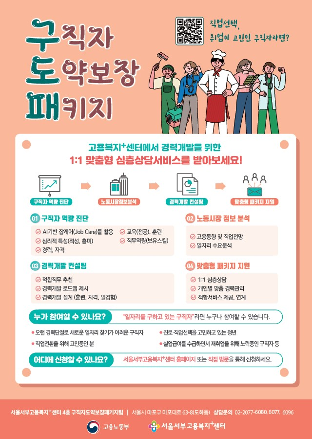 고용노동부는 구직자분들에게 1:1 심층 구직상담을 통해 개인별 직무역량 및 노동시장 정보 분석 제공, 경력개발로드맵제시, 경력설계에 필요한 맞춤형 서비스를 지원하는 구직자도약보장패키지 사업을 시행하고 있습니다. 관심있으신 구직자분들은 아래 홈페이지에 방문하셔서 사업내용 확인 후 홈페이지에서 직접 신청이 가능함을 알려드립니다. 또한 붙임의 참여신청서를 작성하셔서 yuki232323@korea.kr메일로 전송해 주셔도 됩니다. ![]() |